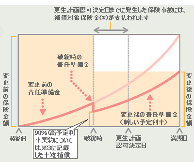 (※)破綻保険会社と保護機構の間で「補償対象保険金の支払いに係る資金援助契約」が締結された場合、 従前の保険金額の90%(高予定利率契約については※3に記載した率)の額で保険金等の支払いが行われます。更生計画に定められた変更後の保険金額が、すでに支払われた補償対象保険金額を上回る場合には、その差額が追加して支払われます。